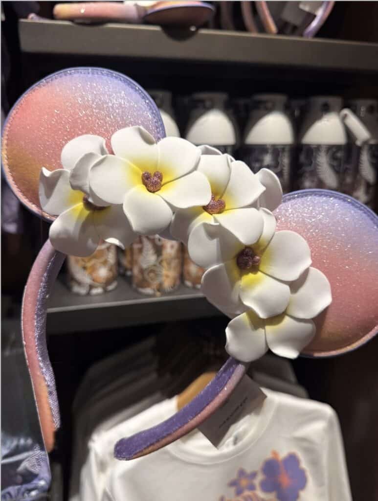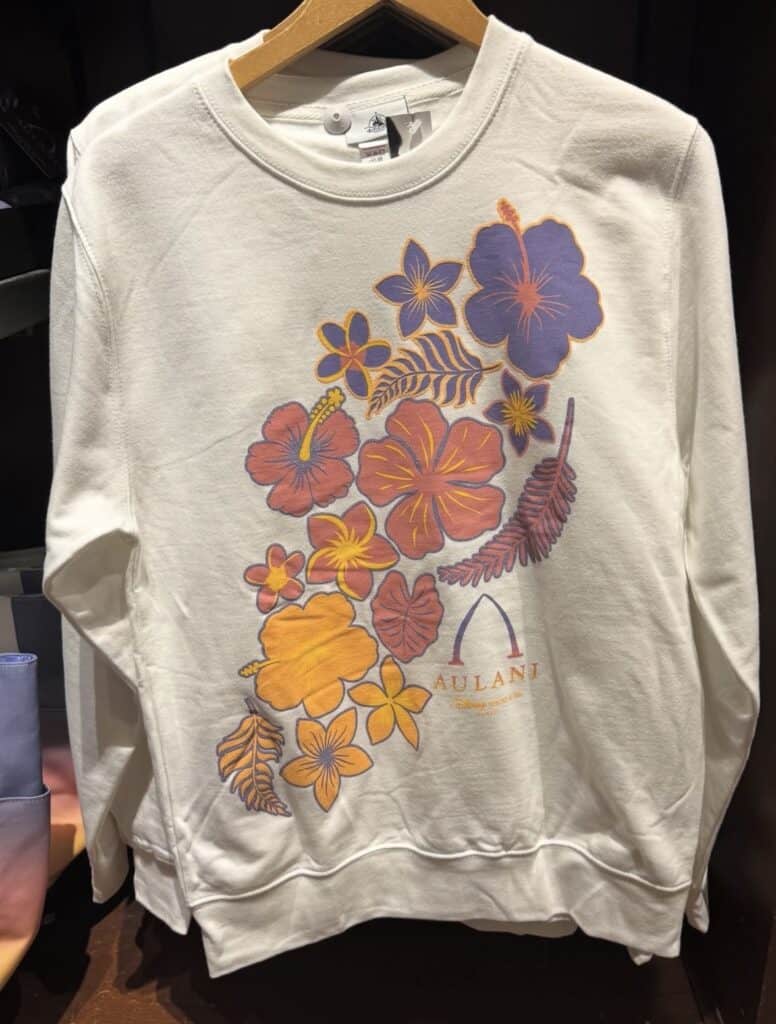 The color palette of the collection centers on soft pink, purple, blue, and yellow hues. Featuring a pink-and-purple ombré sparkle, the ears are simply stunning. They’re topped with a crown of white flowers that reflect the island’s lush landscape. Apparel pieces include a cozy crewneck sweatshirt and a short-sleeved tee. Both showcase the region’s vibrant flora and the Disney Resort name in a bold style.