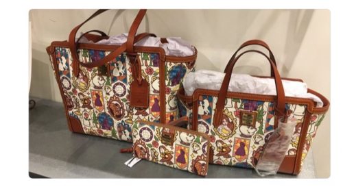 New Beauty and the Beast Dooney and Bourkes were released yesterday in conjunction with the movie release. These new bags feature the same pattern as the ones previously released, but they are available this time in a large tote, a small tote, and a wallet. These also have a gorgeous hang tag with an embossed castle and the words Dream big, Princess. The new bags were announced when the above picture was tweeted by Steven Miller of Disney Parks Blog and can currently can only be found at D-Living in Disney Springs. The wallet retails at $158, the smaller tote at $248, and the larger one at $328.