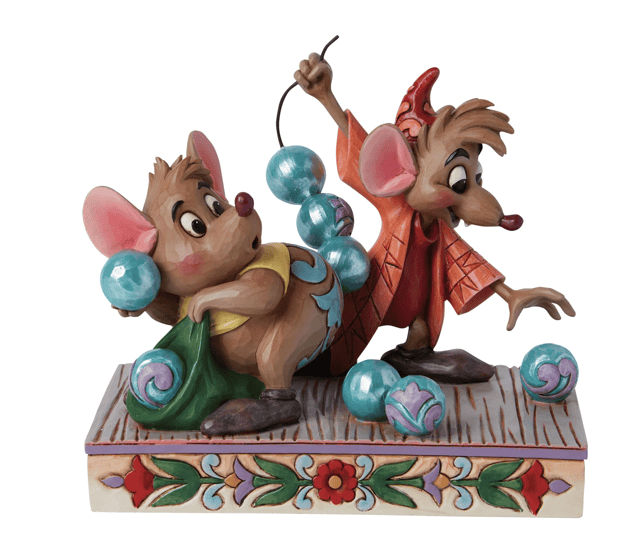 The animal sidekicks are really the stars of the show in this new collection. First up are the lovable Jaq and Gus. We see them here trying to help Cinderella get ready for the ball. It appears that they have broken a string of beads and now Jaq is accidentally putting them on Gus’ tail instead of the string. Hints of Jim Shore’s signature quilt patterns can be seen all over the statue. I love that they blend into the design and match the color scheme of items, like the beads and Jaq’s outfit, that are already in the scene to begin with. Jim Shore never misses a detail. I just love the extra time that was spent making the base look like wood and making Jaq and Gus’ hands look so realistic.