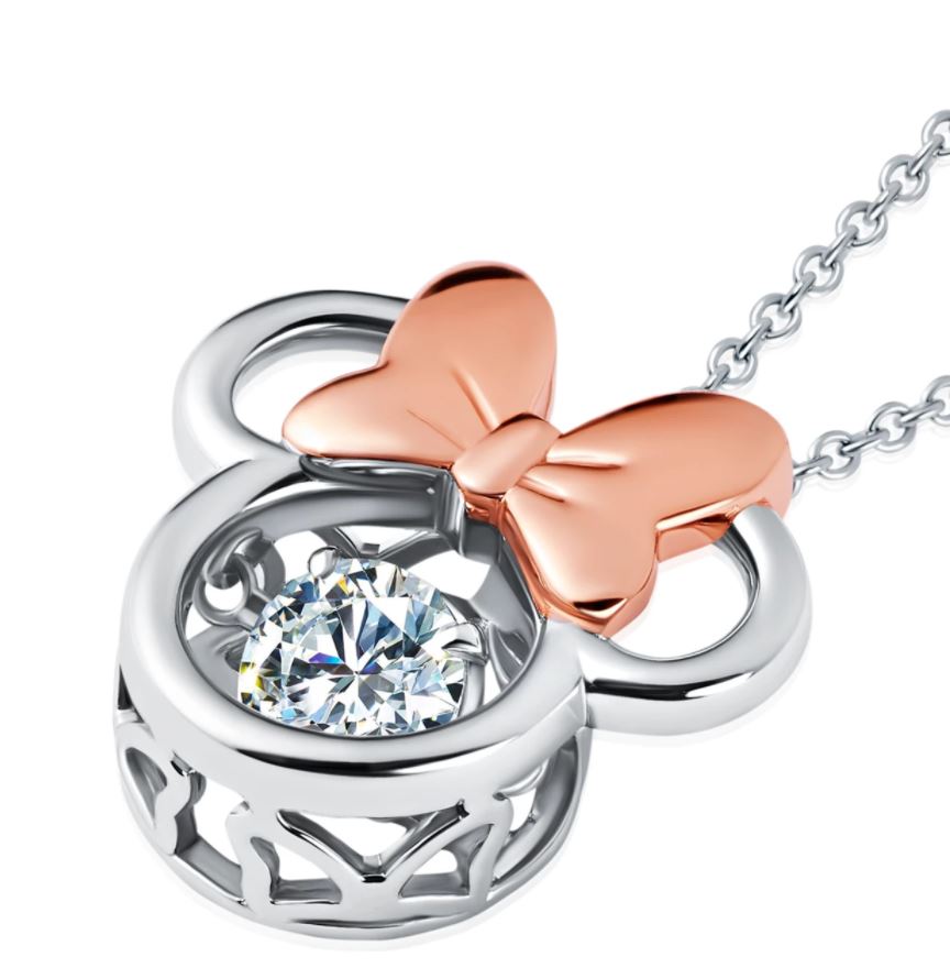 The Minnie Mouse Icon Necklace is a classic silver Minnie icon, topped with a rose gold bow.