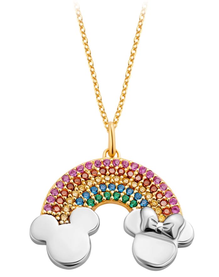 A dazzling rainbow connects the two beloved characters in the Mickey and Minnie Mouse Rainbow Pendant Necklace. The rainbow is in yellow gold, while Mickey and Minnie are in silver – which makes them really pop against the colorful rainbow!