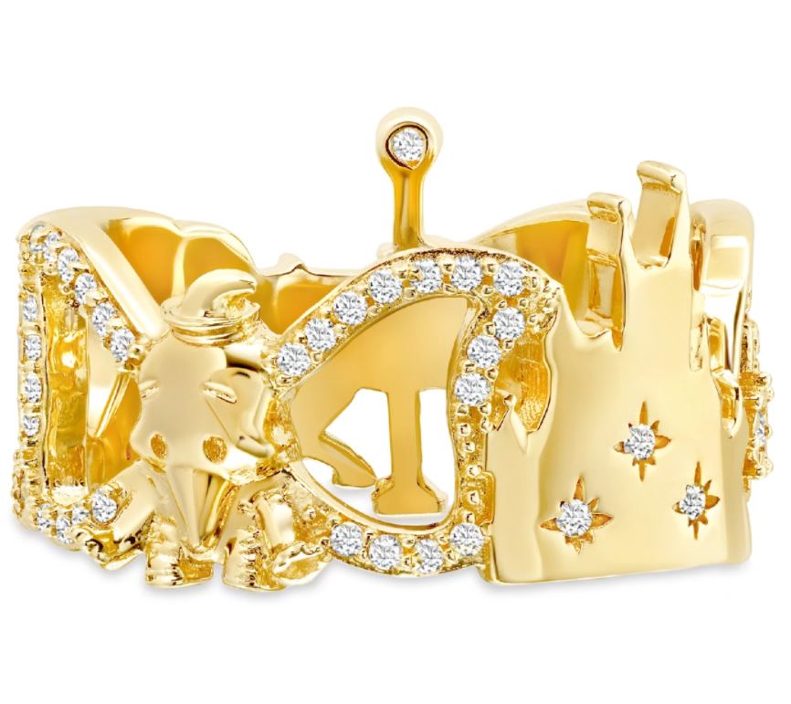 Take Magic Kingdom with you wherever you go with the Fantasyland Ring! It includes Dumbo, Fantasyland Castle, the Clock Face from It’s a Small World, and teacup finished in yellow gold.