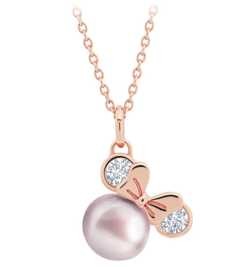 The Minnie Mouse Icon Pearl Pendant Necklace combines Minnie’s iconic outline in rose gold with a gorgeous pink pearl.