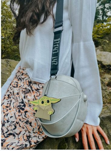 As part of Mando Mondays, the hover pram crossbody is being released today, October 26th ( at 11am EST). It comes out just in time for the Mandalorian Season 2 premiere on October 30th! This glittery silver bag, inspired by The Child’s hover cradle, is highly detailed and unique. Even the strap features the inscription, “The Child” in an Aurebesh style font. The best part of all is the key fob with a chibi style Baby Yoda! I know Baby Yoda isn’t the correct name, but when the little guy is that adorable I think you have to call him Baby Yoda! This crossbody is a definite must-have for any Star Wars fan and retails for $78 HERE.