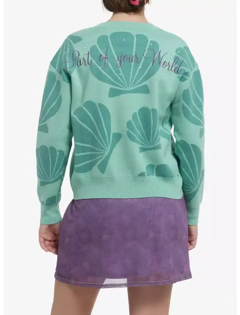 Ariel fans will love this seafoam green cardigan adorned with seashells and ocean-inspired embroidery. Purple accents at the shoulders give it a whimsical under-the-sea vibe, while the button-up style makes it easy to wear with just about anything. It’s a dreamy, oceanic layer for cooler days.
