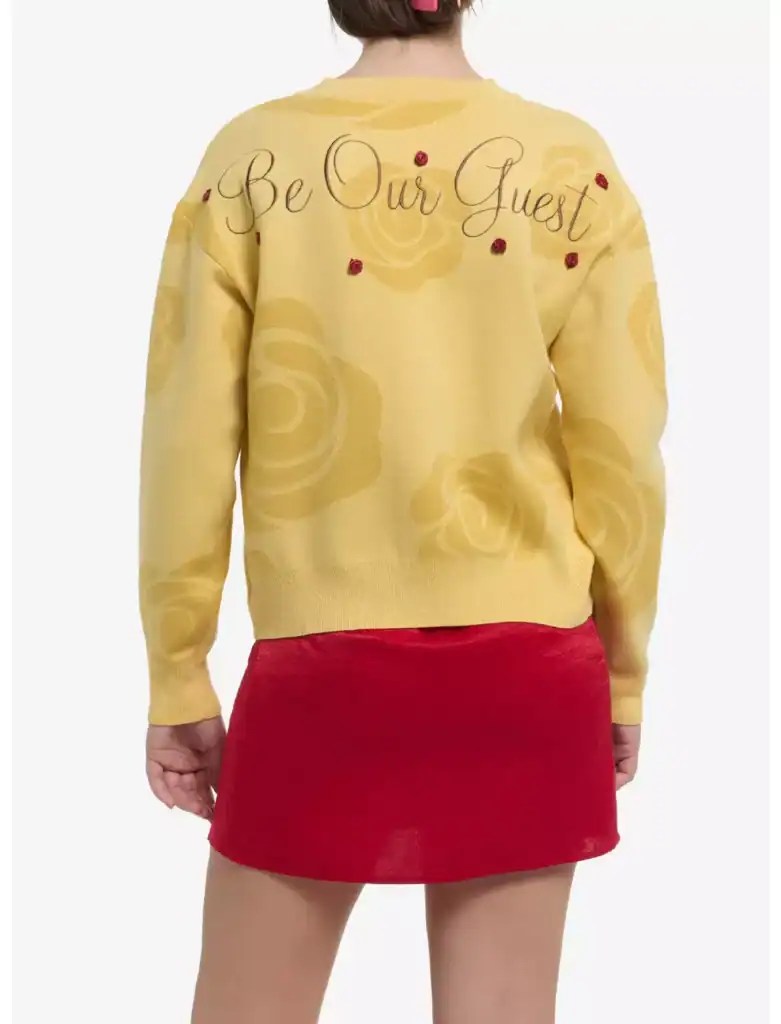 Say bonjour to this bright yellow cardigan inspired by Belle! Scattered embroidery of beloved enchanted objects—like Lumiere, Cogsworth, and Mrs. Potts—decorate the neckline, while large tonal roses are woven into the knit. It’s a beautiful way to bring Belle’s golden gown to your everyday wardrobe.
