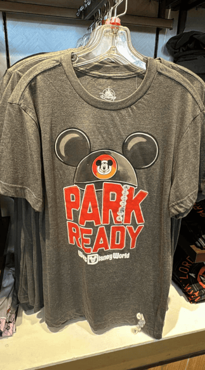 There’s also the “Park Ready” Mickey Ears t-shirt, featuring a bold red and gray design with Mickey’s smiling face front and center. It’s a great choice for anyone who wants to declare their readiness for a magical day in the parks.