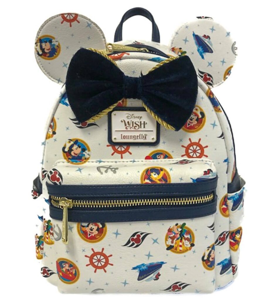 Pack for fun, sun and loads of smiles with this adorable mini backpack by Loungefly showcasing an allover print of Captain Mickey, Donald Duck and Chip ‘n’ Dale amid nautical motifs. This whimsical backpack also features Mickey and Minnie’s signature ears, a deep-blue velvet bow with gold cording and a metal plate engraved with the Disney Wish and Loungefly logos. $75.00.