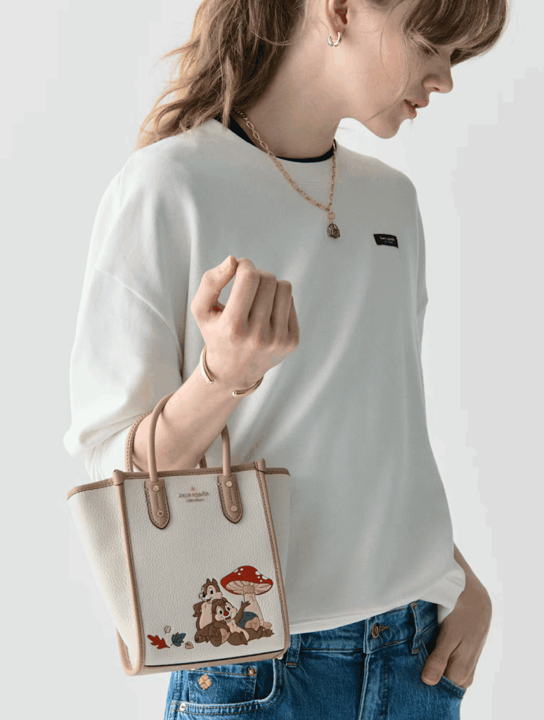 The biggest piece in the collection is the Mini Ella Tote ($209). This is a small bag for essentials, and I am calling it chipmunk size! Chip & Dale are casually hanging out under a mushroom, looking for their next adventure!