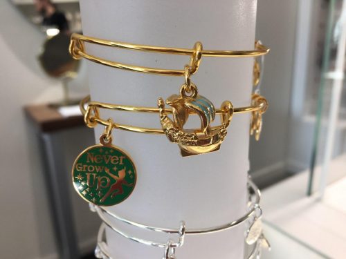 Last but not least, is the Peter Pan’s Flight Alex and Ani pair. This is one of the most popular attractions in Fantasyland, so I’m so happy to see it got an inspired bangle set too. This is also the only gold toned pair in the collection. The round charm has a deep green background, just like Peter’s hat, and says “Never Grow UP” with a silhouette of Peter Pan and sprinkles of pixie dust. The charm is even of the boats you take flight over Neverland in, complete with a colorful striped sail.