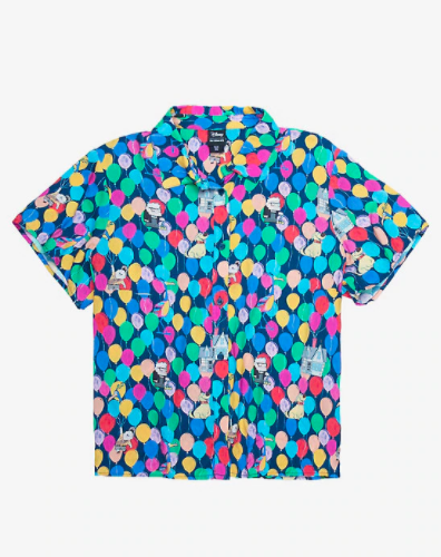 The colorful and iconic balloons from Up make this woven button-up top pop. Floating throughout the allover balloon print are Carl, Russell, and Dug on their way to adventure.