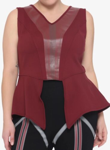 Wanda may have said, “I’m doing my best to fit in,” but the Her Universe Marvel Wandavision Wanda Girls Peplum Top is a true standout piece. This figure-hugging peplum top has a V-neckline and a cutout in the front hem. It also has a coattail-esque split in the back. The printed chest details really help to recreate Wanda’s look in the finale! You can wear this as part of a total Wanda Maximoff outfit, or you can pair it with skinny jeans for a hint of the Scarlet Witch.