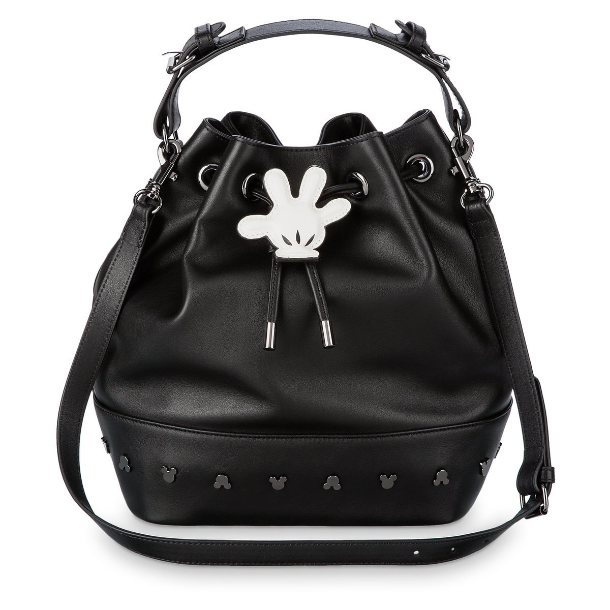 This cinch style black leather tote brings out a bold chic style. The drawstring closure is even fastened with a white Mickey glove toggle. Pewter-tone Mickey icon studs encircle the bottom for a daring look.