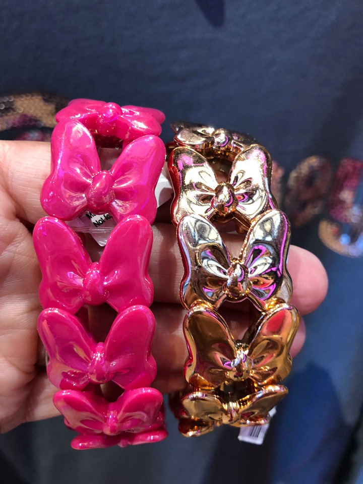 The bracelets are super fun, and nostalgic. They are chunky plastic Minnie bows strung on a stretchy elastic string. They have plenty of give so they slide over your hand effortlessly, but snap back into their shape so you don’t have to worry about it falling off. The Briar Rose Gold bracelet has a metallic finish to it, while the Imagination Pink bracelet has a . oil slick like finish.