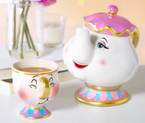 The new twist on an old favorite, is that this cup is inspired by the scene when Chip shows Belle his “trick” of blowing bubbles in the cup! He comes complete with a cheerful look of mirth on his face, and blushing red cheeks. The back of the cup is dappled in bubbles! The “chip” in the cup is a slight indention, to give the look of a crack, with out worrying about spilling your coffee or tea.
