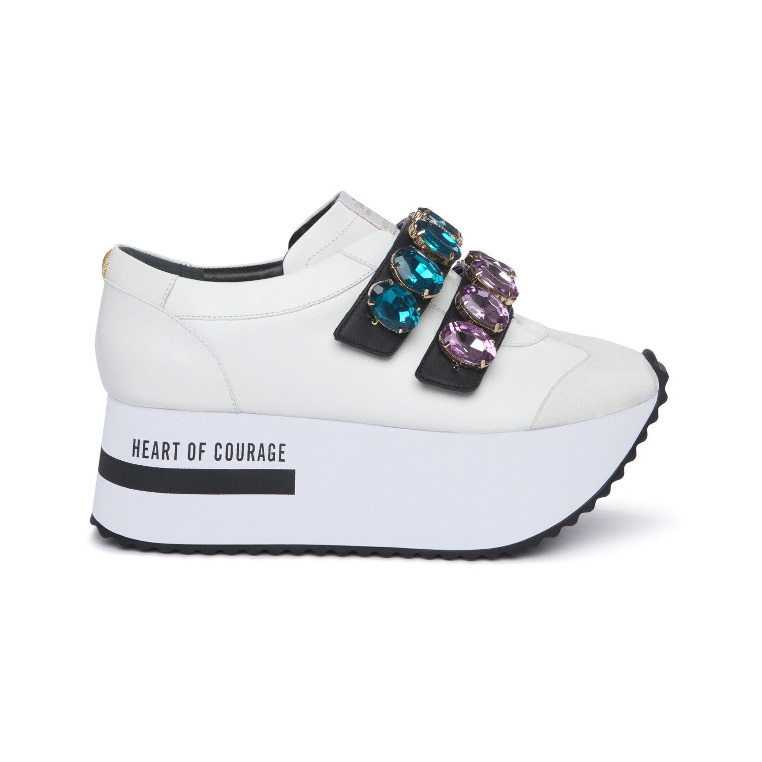 Stacked sneakers featuring embellishments and vivid colors give off a sassy 90s vibe, which is fitting since that is when the animated classic debuted. The oversized jewels on the white sneakers remind us of Jasmine’s iconic tiara, while the Tiger sneakers pay homage to her beloved pet Rajah.