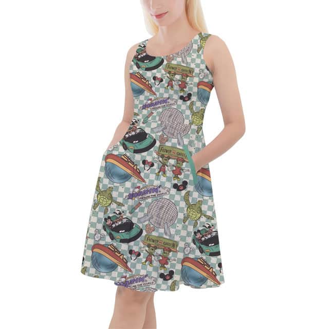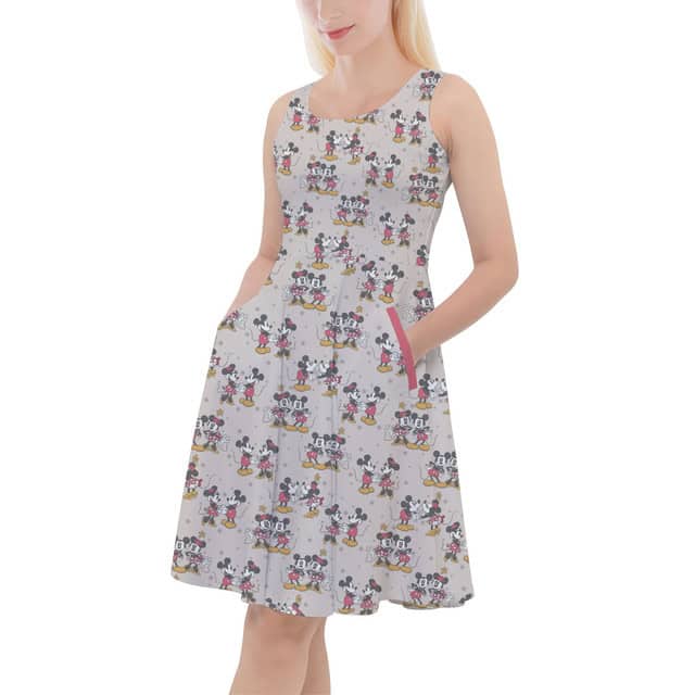 Show your love for classic Mickey and Minnie Mouse in faded vintage colors. This dress is perfect for any day at Disney, for dinner out at Disney Springs, or whenever you want to show your love for the famous couple.