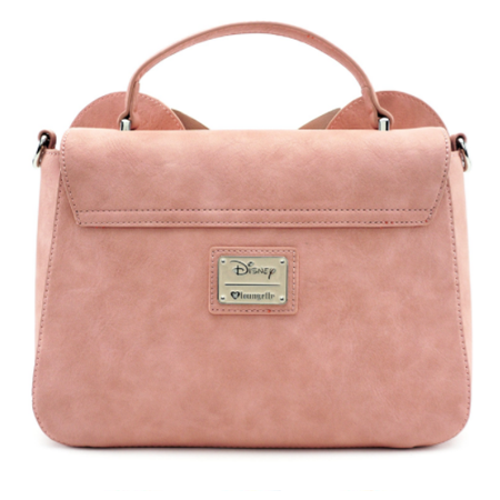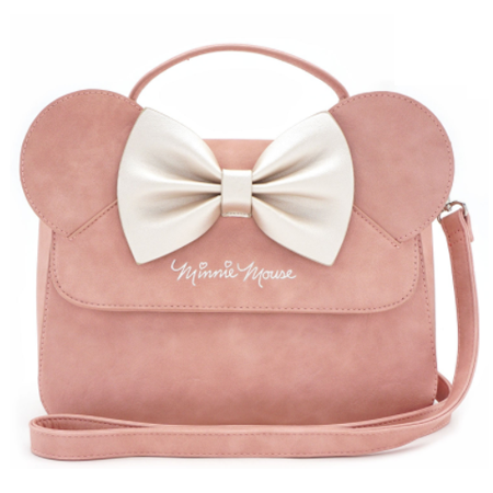 This faux leather dusty rose crossbody from Loungefly, has a fold over close, with adorable mouse ears that stick up. The middle of the ears has a foil rose gold bow nestled between, with Minnie’s signature below. This bag can be used as a crossbody, or a handbag if you remove the strap. You’ll find it at Loungefly.com for $64.00.