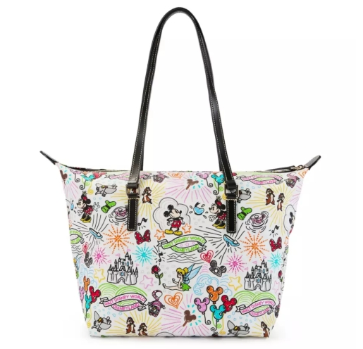 The collection now includes a spacious tote bag, ideal for carrying everything you need with a bit of magic. Whether you’re heading to the parks or out for a casual day, the tote’s vibrant sketches of beloved Disney characters and icons are sure to turn heads. It’s roomy and stylish, making it a perfect addition to any wardrobe.