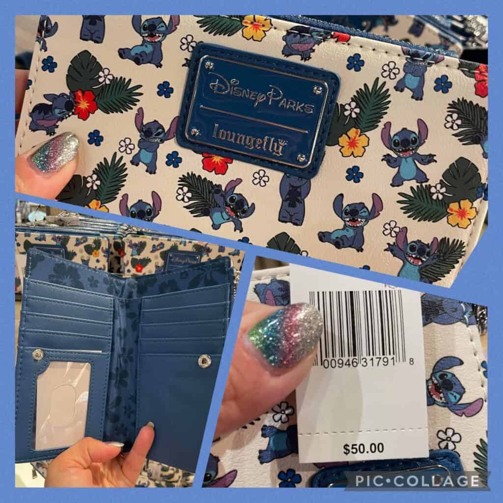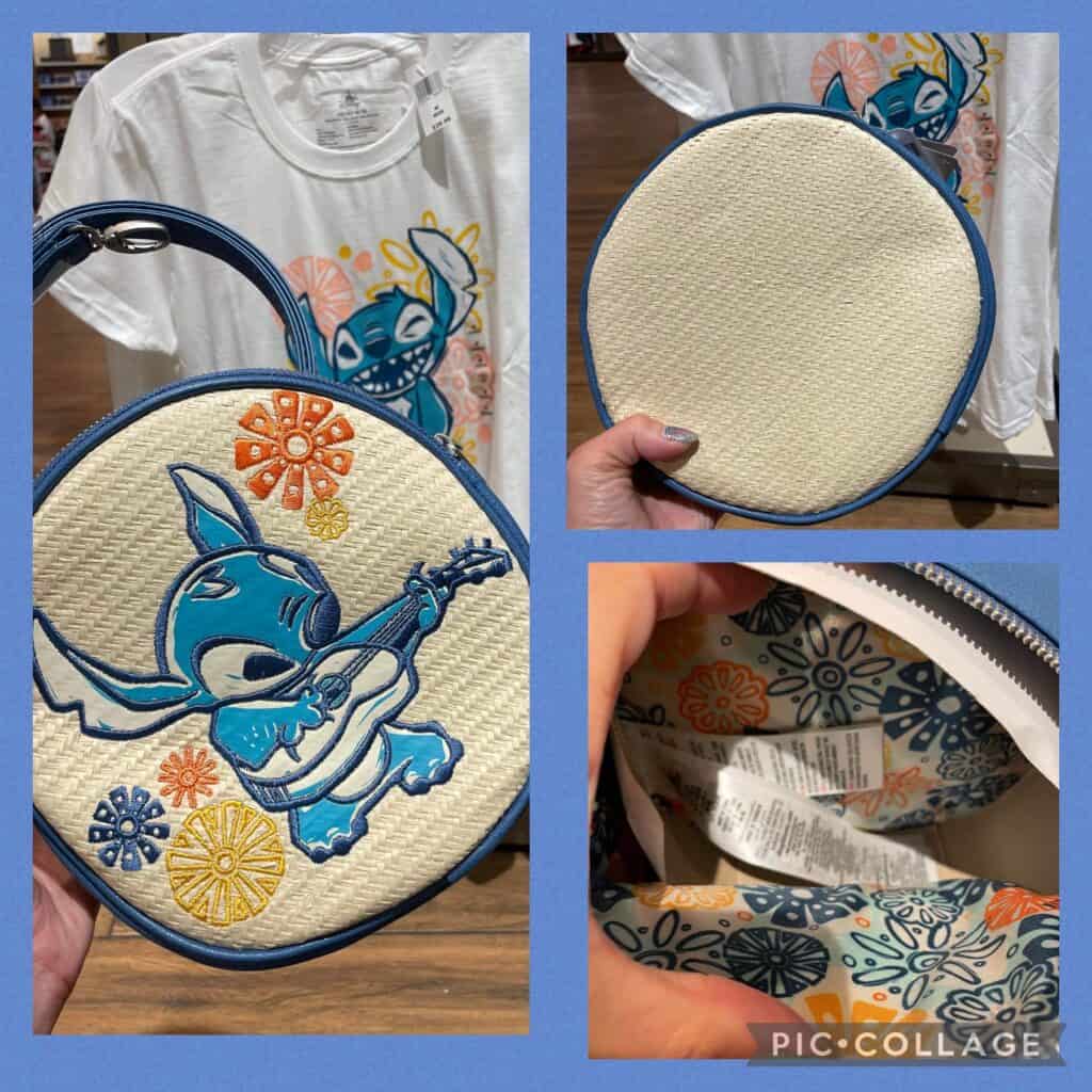 The first of the three pieces is an adorable crossbody found either at the parks or by clicking here: shopDisney. This woven circular bag features an embroidered Stitch rocking out on his guitar…. probably to Elvis! The interior lining is a colorful floral pattern that corresponds with the embroidered flowers on the front. How adorable would this look at your summer luau?