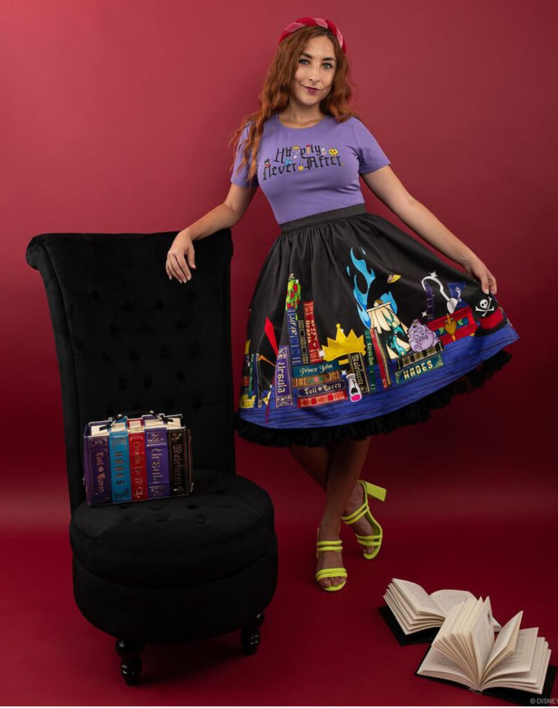 Then there is a Disney Villains skirt and coordinating purple tee. The skirt features books and various items that represent the Villains including a poison apple and Captain Hook’s hook. The tee, on the other hand, says “Happily Never After” and also features items that represent the Villains including Ursula’s shell necklace. This combo would look adorable with the Disney Villains books crossbody or backpack!