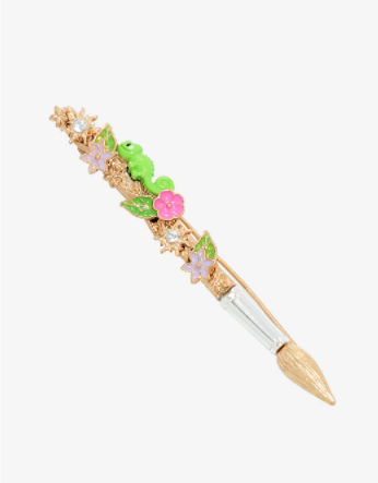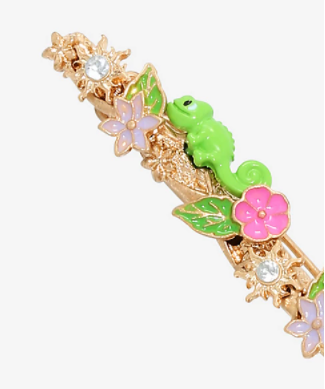 Complete your Tangled-inspired look with this Pascal Paintbrush Hair Clip. The details on this hair clip are amazing! Pascal clings to a golden paintbrush that is covered with pink flowers and other icons from the film.
