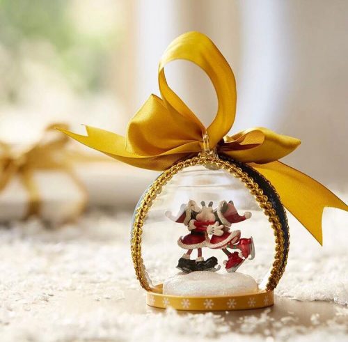 Mickey and Minnie share a holiday kiss as hand-painted miniature figures within an old-fashioned, decorated glass globe ornament. Golden ribbon, snowflake fabric, and glitter trims add a certain turn of the century charm.