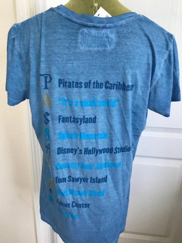 It’s you’re curious as to which attraction each letter represents, don’t worry! There’s a “cheat sheet” on the back to help you if you can’t remember. The fabric has a very soft and cozy feel to it, and the distressed wash of it gives it the vibe of a well loved tee, even though it’s brand new!