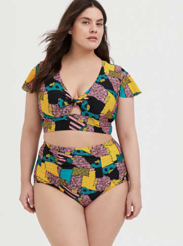 Suit up in stitches with this Nightmare Before Christmas Sally-inspired Bikini! The patchwork swim top has a flutter sleeve and also features a knot front with a cropped fit. The patchwork inspired bottoms have a high waist, and lots of ruching for a flattering fit.