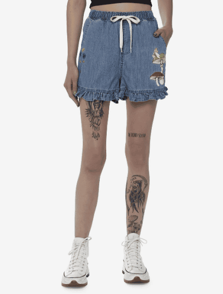 Add some sass to your Neverland look with these denim shorts! Tinker Bell is ready to sprinkle some pixie dust to your look with these ruffle shorts. The design features Tink pouting on some mushrooms on one leg and dandelions on the other leg.