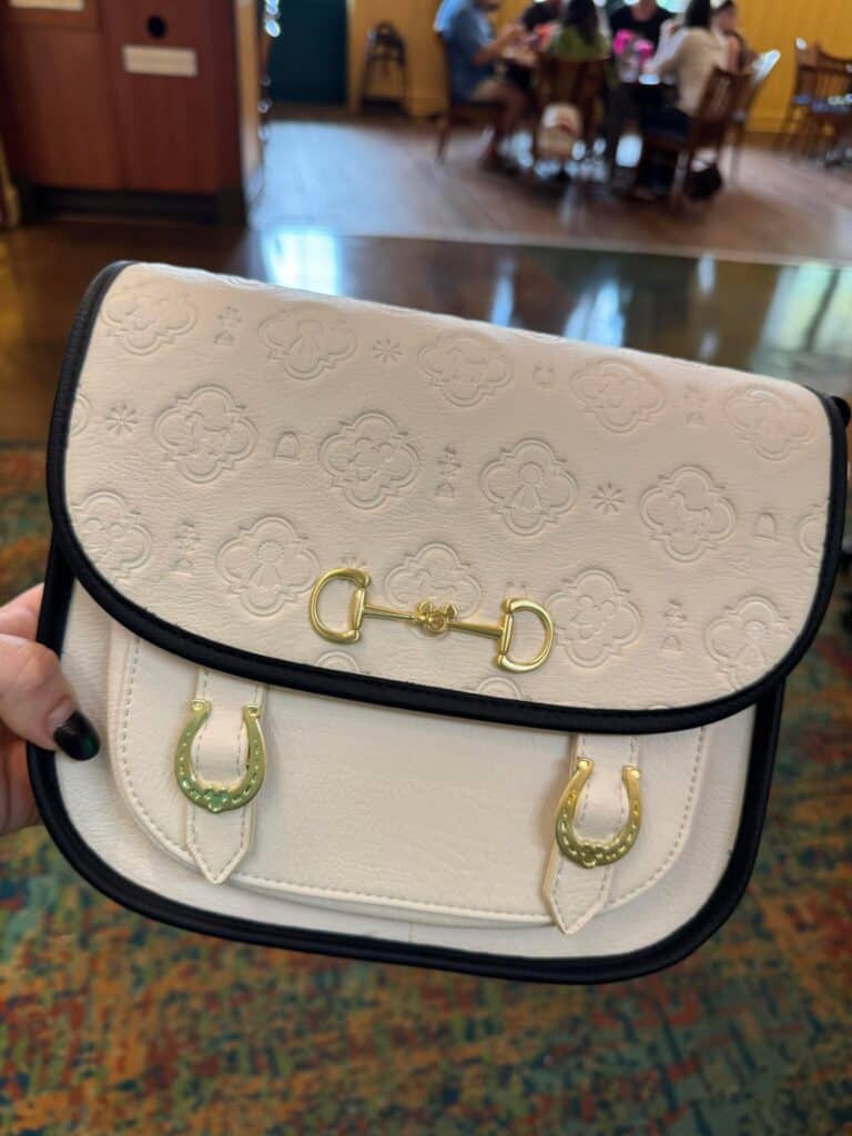 If you’re looking for a chic and stylish bag to carry this season, look no further! This Loungefly crossbody features a beautifully embossed pattern, gold hardware, and equestrian details, as well as white embroidery on the back of the bag. The cream bag with black and gold accents is something that will always be in style!