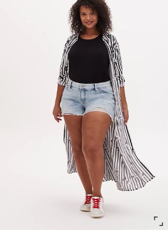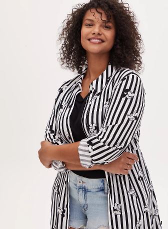You’ll look super sweet in stripes! This duster kimono is inspired by a shirt design and made from smooth challis fabric with allover Mickey and Minnie magic. The spread collar, open front, long sleeves, and button cuffs all add to this dramatic, yet casual look. You can pair this with shorts in the summer and jeans in the fall for year-round style.