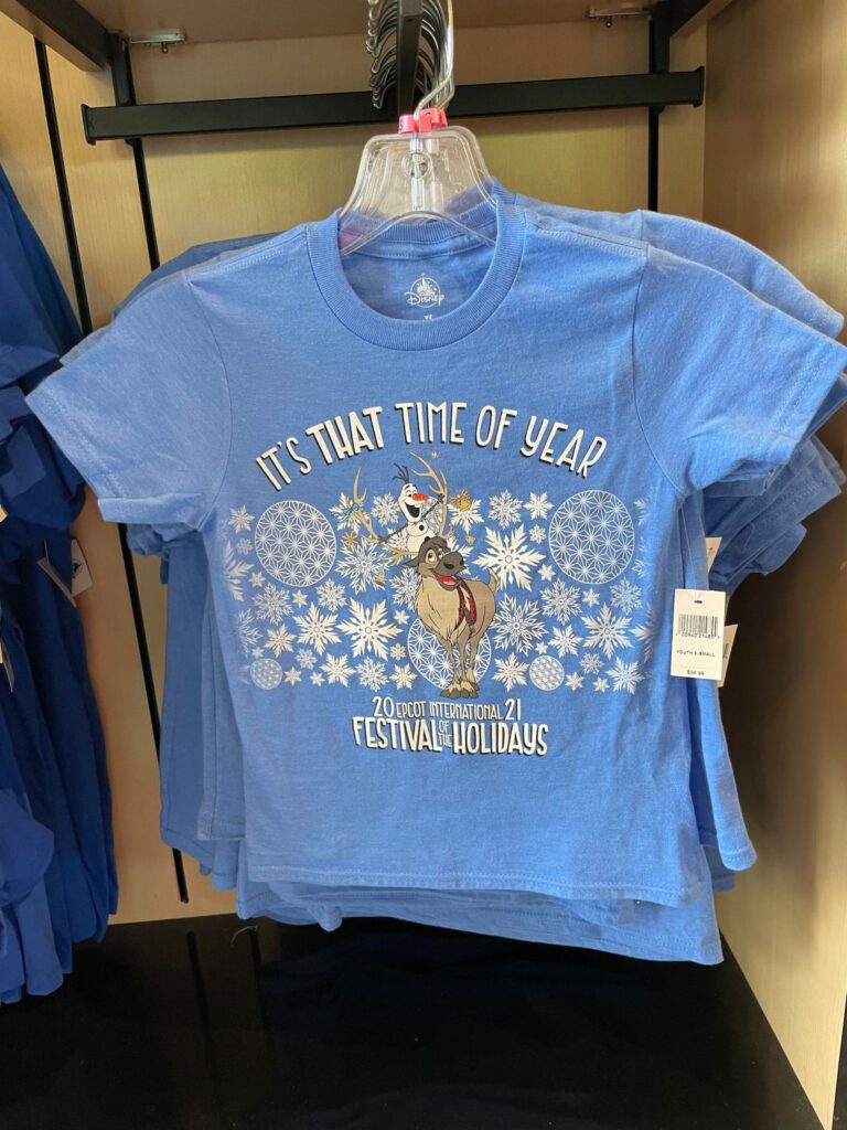 Let’s talk about the one thing I am always most curious about. The Spirit Jersey. This year the jersey is a lovely blue and Olaf is letting us know that it is that time of year! The pattern not only features Olaf and snowflakes but Spaceship Earth in it’s most recent design can be seen in the pattern, as well. I would be thrilled to wear this on my next holiday trip!