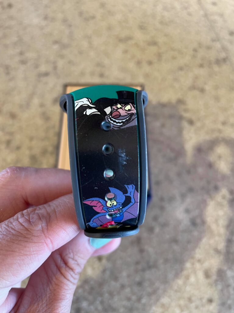 This green Magicband celebrates the 35th anniversary of the film! It features the heroes Basil, Dr. Dawson, and Olivia Flaversham on one side, while Professor Ratigan and Fidget are on the opposite side.