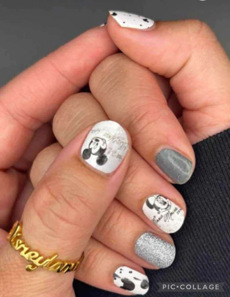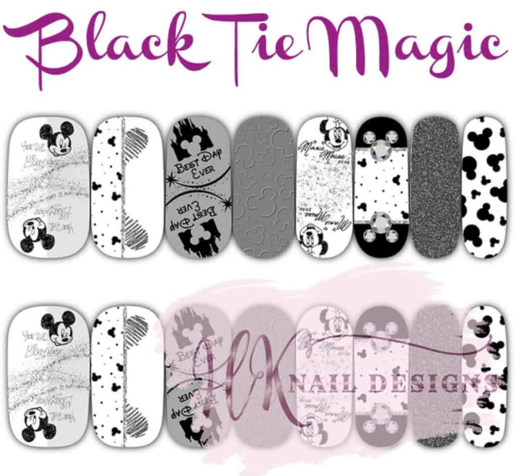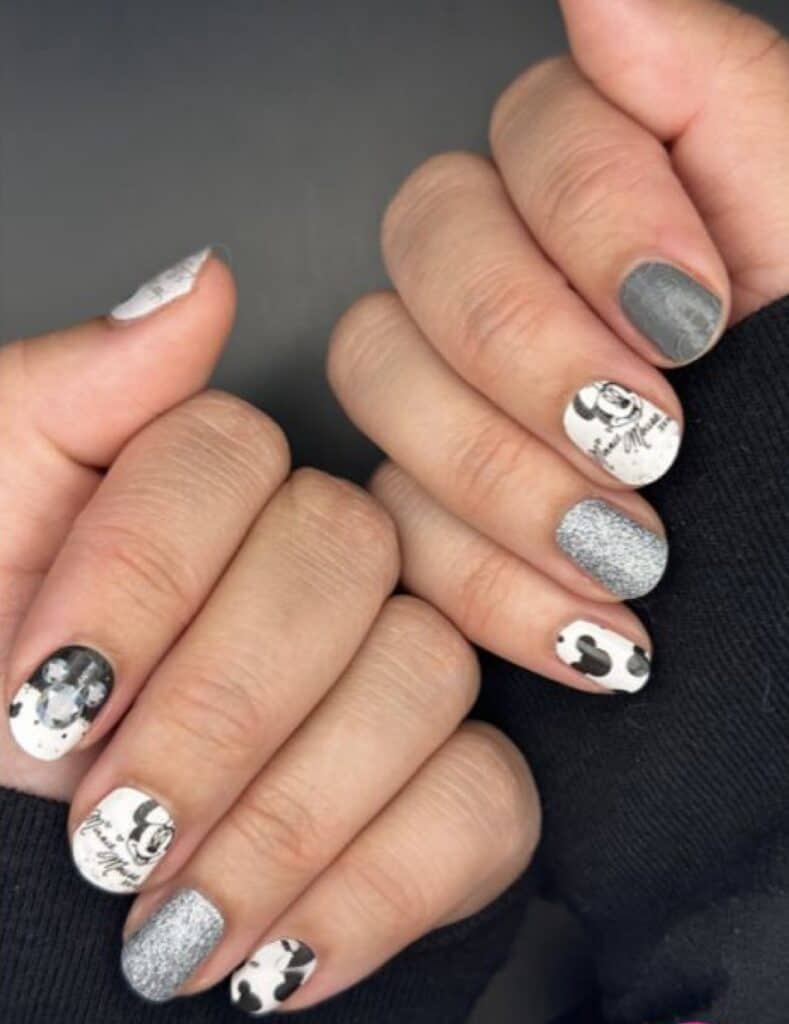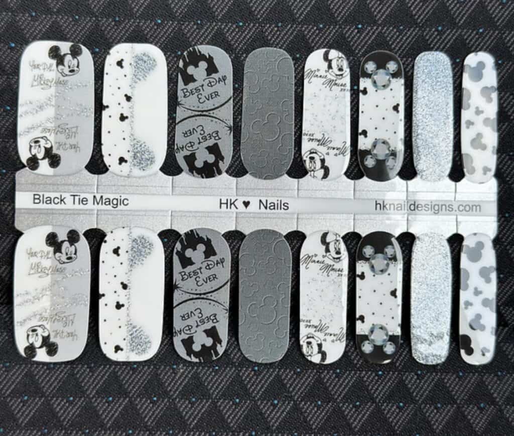 Black Tie Magic is the latest fan-favorite release from HK Nails, blending timeless Disney charm with chic sophistication. This design pairs classic sketches of Mickey and Minnie with striking monochromatic patterns. Touches of silver glitter add a dash of sparkle. The vintage-inspired look feels both playful and polished, and the black-and-white palette makes it a versatile choice, perfect for multiple Disney days without clashing with bold colors.