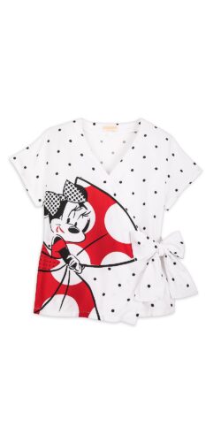 The collection also includes a tie front blouse that is white with small black polka dots and features Minnie wearing a red with white polka dots dress. I love how the bow on the blouse matches Minnie’s bow!