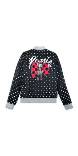 The zip jacket is black with white polka dots and has grey trim at the collar, waist, and cuffs. There is a small embroidered red bow and the words “Minnie Parisienne” on the front while the back says Paris and has Minnie. She is wearing a very fashionable white and black polka dot dress and has a big red with black polka dots bow behind her. She looks like a butterfly!