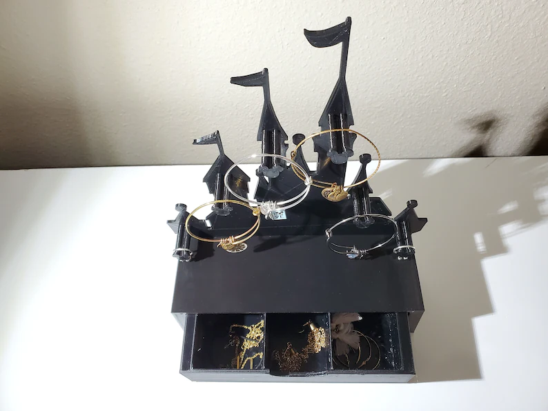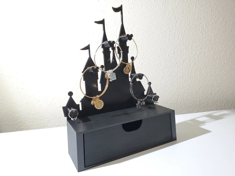 In the silhouette of a castle, it can hold everything from watches, bracelets, rings, and earrings. I love that I could finally display my Alex and Ani collection with this! You can then store everything else in the built-in drawer. Customize your selection with either one big drawer or a compartmentalized drawer for easy organization.