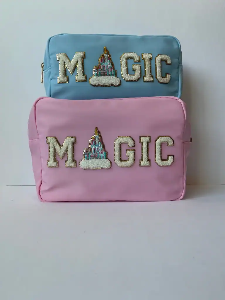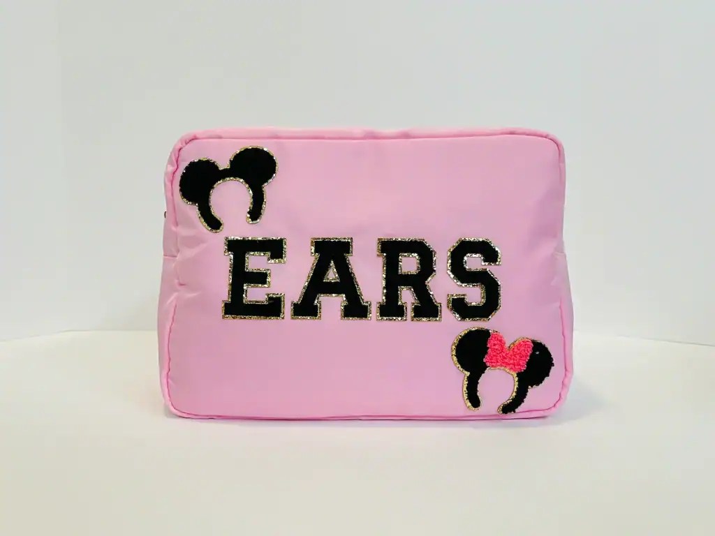 Now that you have picked out and packed up your Ears, it’s time to think about magic. Another word for magic is make-up! This large cosmetic bag (10″ x 5.5″ x 3″) will hold it all! Again, this bag is available in a range of different color options and includes the five chenille patches to make it extra magical.