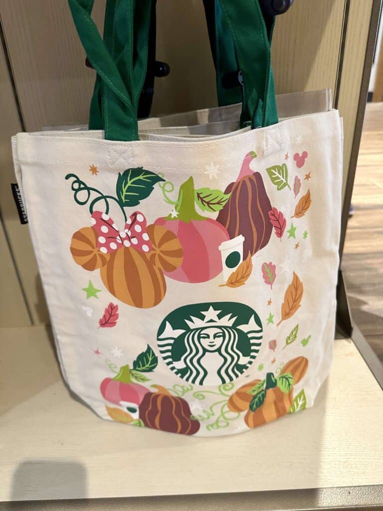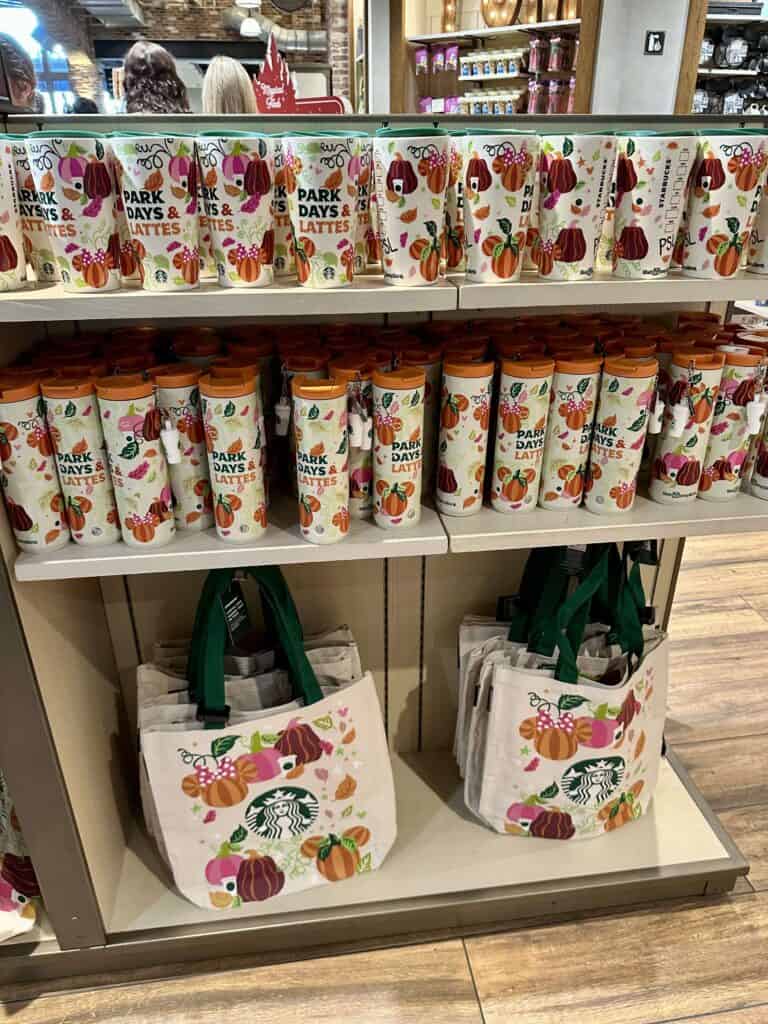 I’m going to show the 2 styles of drinkware together but they could not be more different! The first is the tall, skinny, metal tumbler perfect for cold or warm drinks! This one shows the print of Mickey pumpkins, leaves, and Stabucks cups along with Walt Disney World on the bottom (there is also a Disneyland version in California)! This one comes with a charm of a Starbucks cup! That’s just too cute!