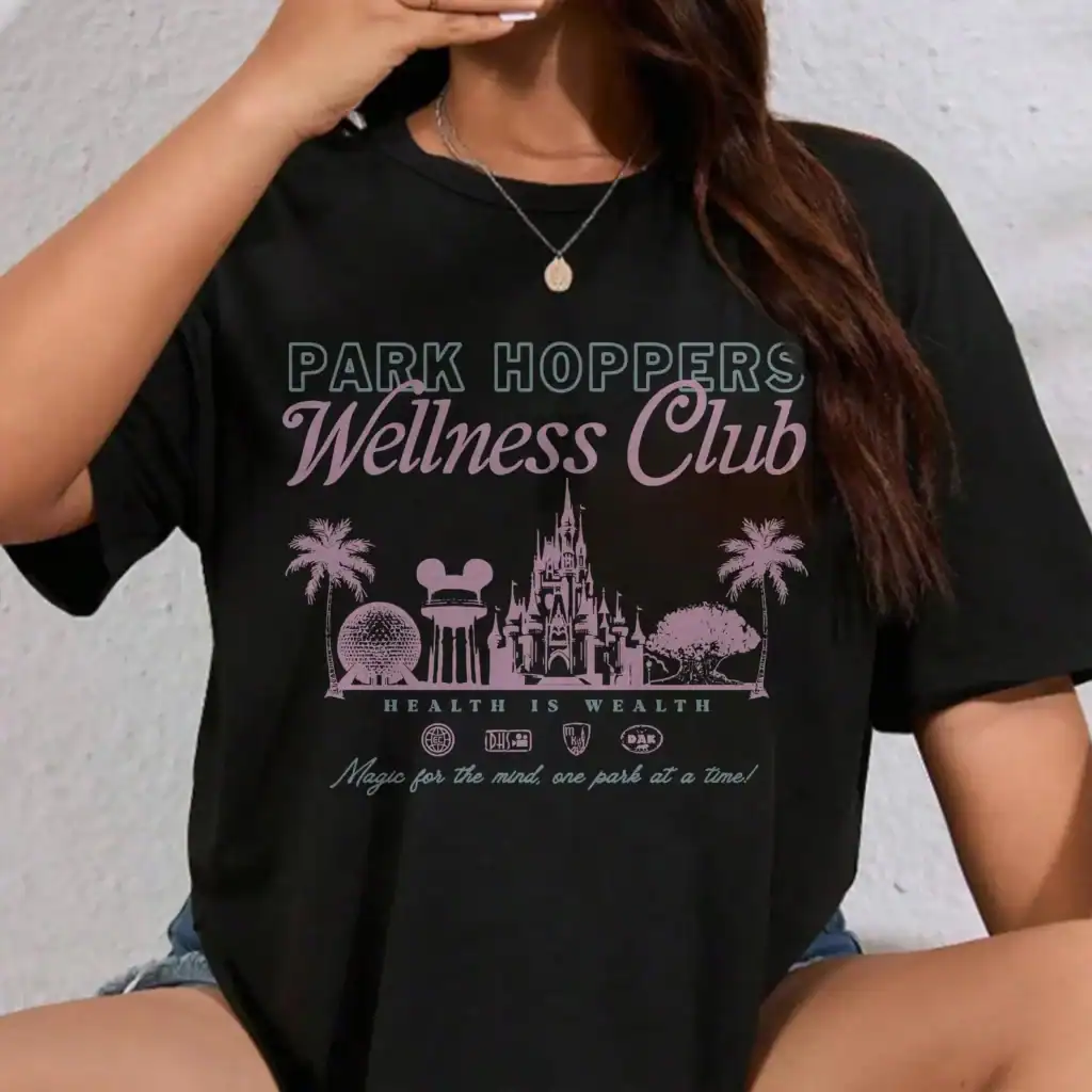 The shirt features pastel pink lettering that reads “Park Hoppers Wellness Club,” paired with whimsical park icon silhouettes and playful nods to self-care. With uplifting phrases like “Health is Wealth” and “Magic for the mind, one park at a time,” the design feels like a gentle reminder that your Disney adventures can be just as good for your soul as they are for your Instagram feed.
