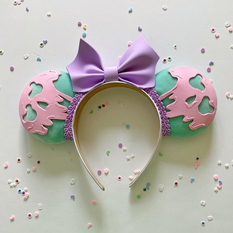 These ears are meant to resemble the Poison Apple from Snow White but with a pastel twist to them. The headband is 1” wide and the ears stand 4-6” tall depending on embellishments and are 8-10” across for both ears. All items are made from a combination of fabric, foam, felt, and paint.