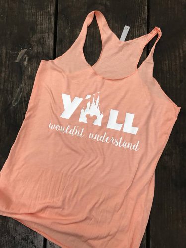 I cannot be the only fashionista out there that has to defend my love of Disney. How many times have you heard people talking behind your back that you are too old to love Disney and Disney is for kids? What a crock! I have found the perfect tank to wear around non Disney people and it’s even more perfect because I live in the south!