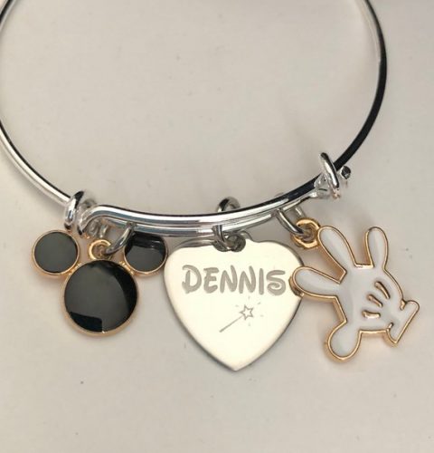 Each Mickey or Minnie themed bracelet includes a stainless steel engraved charm that can be personalized with your own name, date, or phrase. The Mickey Mouse bracelet also includes a black Mickey head charm and a white glove charm. The Minnie Mouse bracelet includes a white Mickey head charm and a Minnie bow charm.