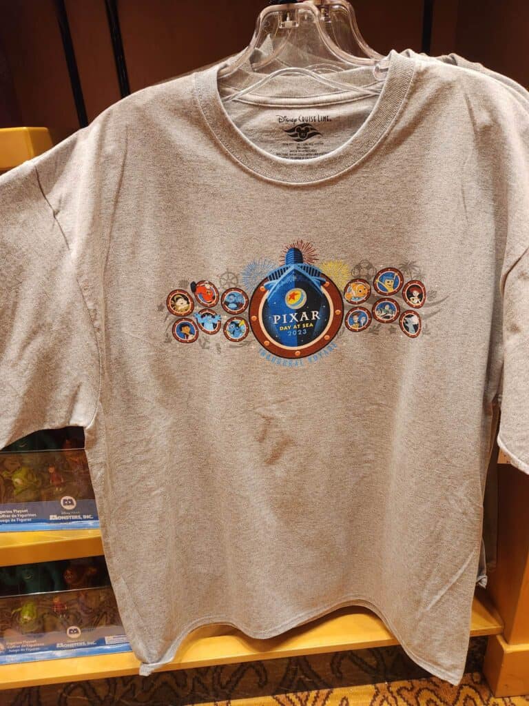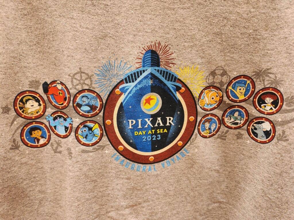 The short sleeve option is a classic gray t-shirt. The Pixar Day at Sea logo is front and center on this style. Surrounding the logo are some of our favorite Pixar characters from Up, Monster’s Inc., The Incredibles, Finding Nemo, Inside Out, and more.