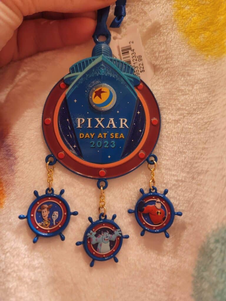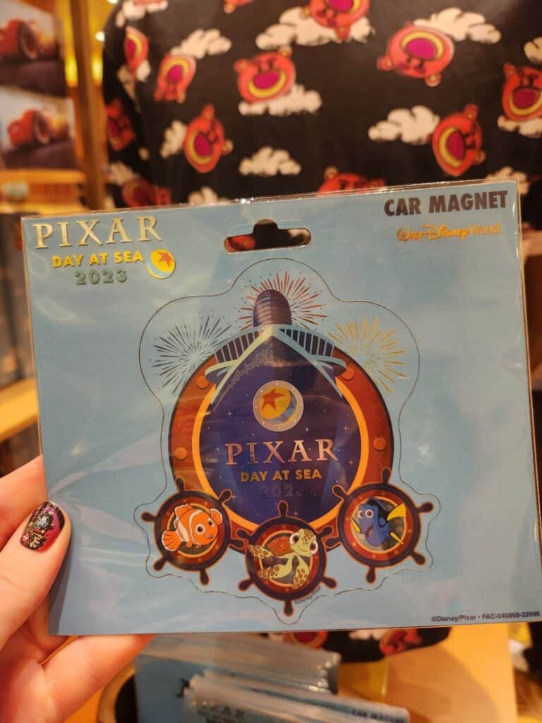 Rounding out this collection, you’ll find a pin, ornament, and car magnet. All of them feature the Pixar Day at Sea Logo, along with different Pixar characters. The pin highlights Sully, Mr. Incredible, and Nemo, while the ornament showcases Woody and Forky, Sully, and Mr. Incredible. Finding Nemo friends star on the car magnet with Nemo, Squirt, and Dory front and center.