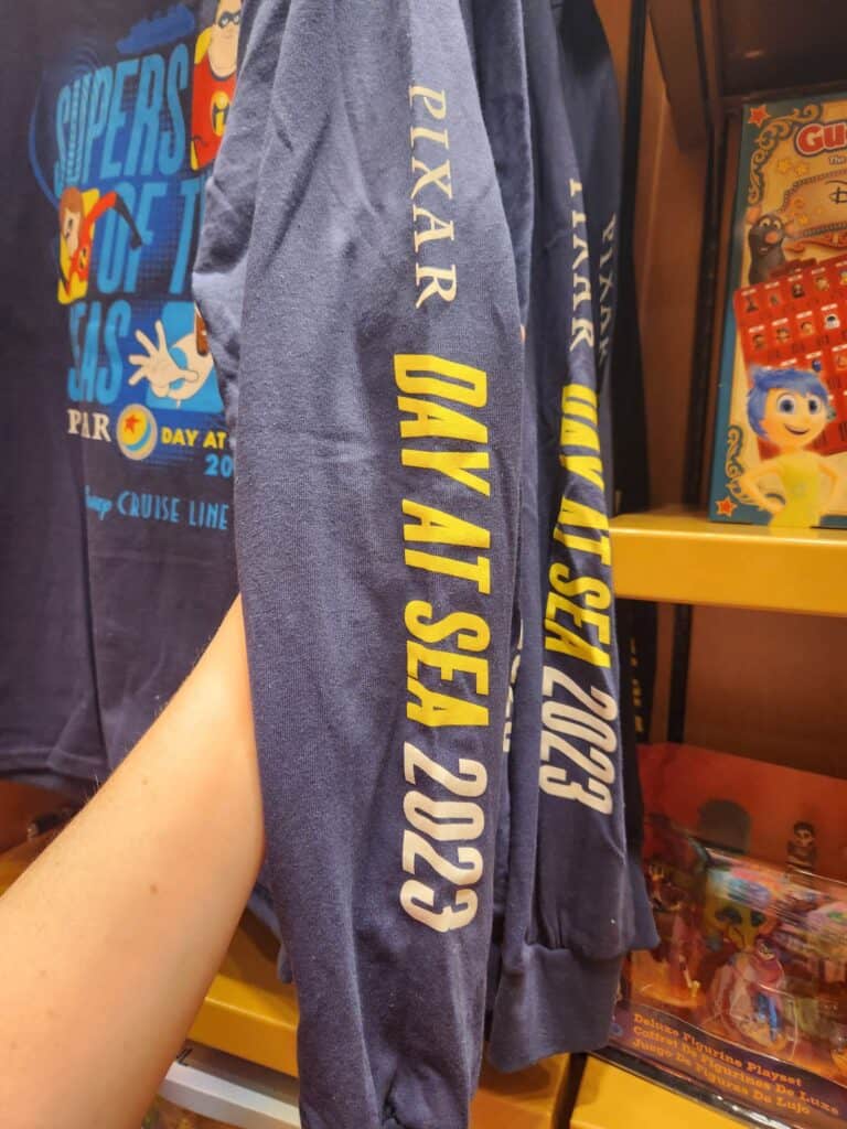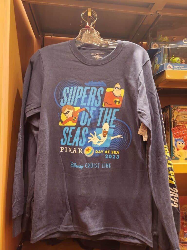The long sleeve shirt features Pixar friends from The Incredibles with the phrase “Supers of the Sea.” In addition, this design has the Pixar Day at Sea logo, is dated for 2023, and features the Disney Cruise Line logo as well.