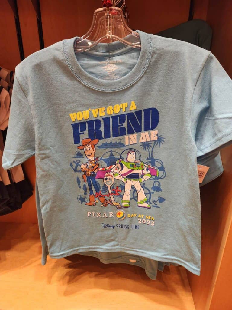 Little sailors can join the adventure as well with this unisex kid’s shirt. The design includes Woody, Buzz Lightyear, and Forky from Pixar’s Toy Story. It reads “You’ve Got a Friend in Me” along with the different sailing logos.