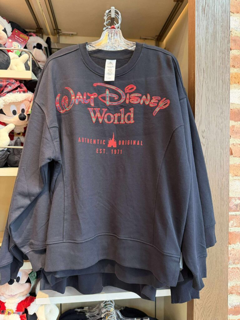 Two sweatshirts are available which further continue our plaid-a-palooza. Elect the forest green hoodie with bold red designs on the back, accompanied by appliqued plaid letters, spelling out “Walt Disney World.” Or the charcoal gray crewneck showcasing the WDW logo accented with plaid detailing. Both feature a red outline for a touch of holiday flair. These cold weather pieces blend comfort and nostalgia, making them ideal for chilly park days or adding a bit of Disney magic to any winter wardrobe.