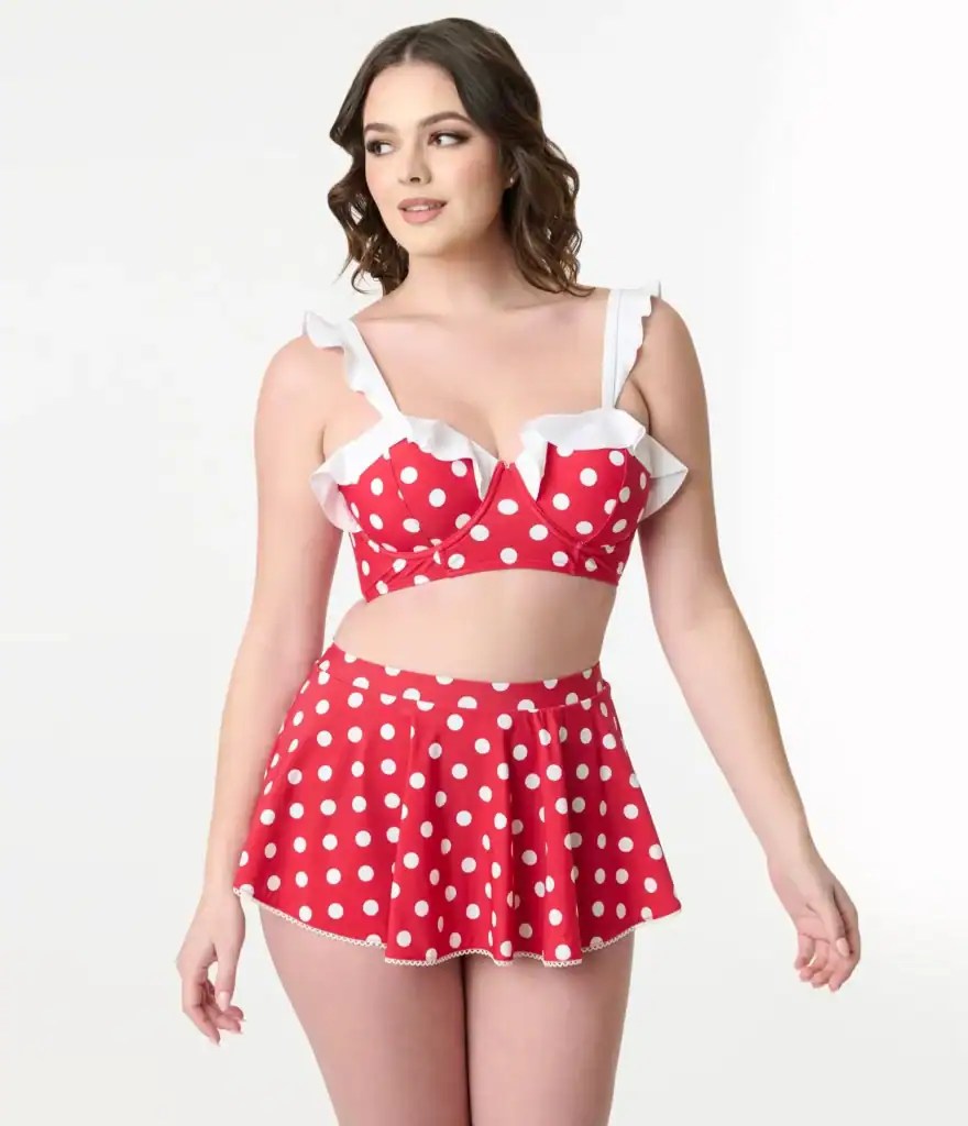 Dare to bare some skin with Unique Vintage’s swimwear separates. Rock the Dots along with Minnie Mouse on the flirty red and white polka dot 2-piece. The bustier top offers support with underwire, while the adjustable straps and lace-up top personalize each fit. The swim skirt still offers coverage for your bottom half. It’s no secret that black offers a slimming look. The Princesses agree! Find their outlines in white against a black background on the second 2-piece offered. Red shoulder straps and bow at bustline offer a bold pop of color!
